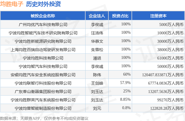 本站消息,根据天眼查APP显示,均胜电子(600699)新增一起对外投资事件,被投资公司为宁波均普智能制造股份有限公司,法定代表人刘元方道配资,投资占比为0.8%。该公司从事通用设备制造业,注册资本为122828.28万人民币。目前,均胜电子共存在对外投资11项,详见下表:
