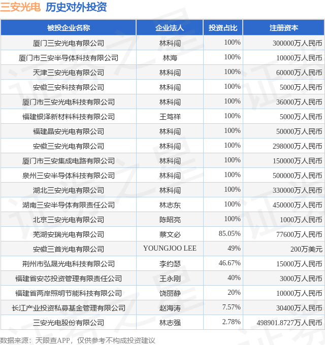 本站消息,根据天眼查APP显示,三安光电(600703)新增一起对外投资事件,被投资公司为三安光电股份有限公司,法定代表人林志强,投资占比为2.78%。该公司从事计算机、通信和其他电子设备制造业,注册资本为498901.8727万人民币。目前牛在线,三安光电共存在对外投资20项牛在线,详见下表: