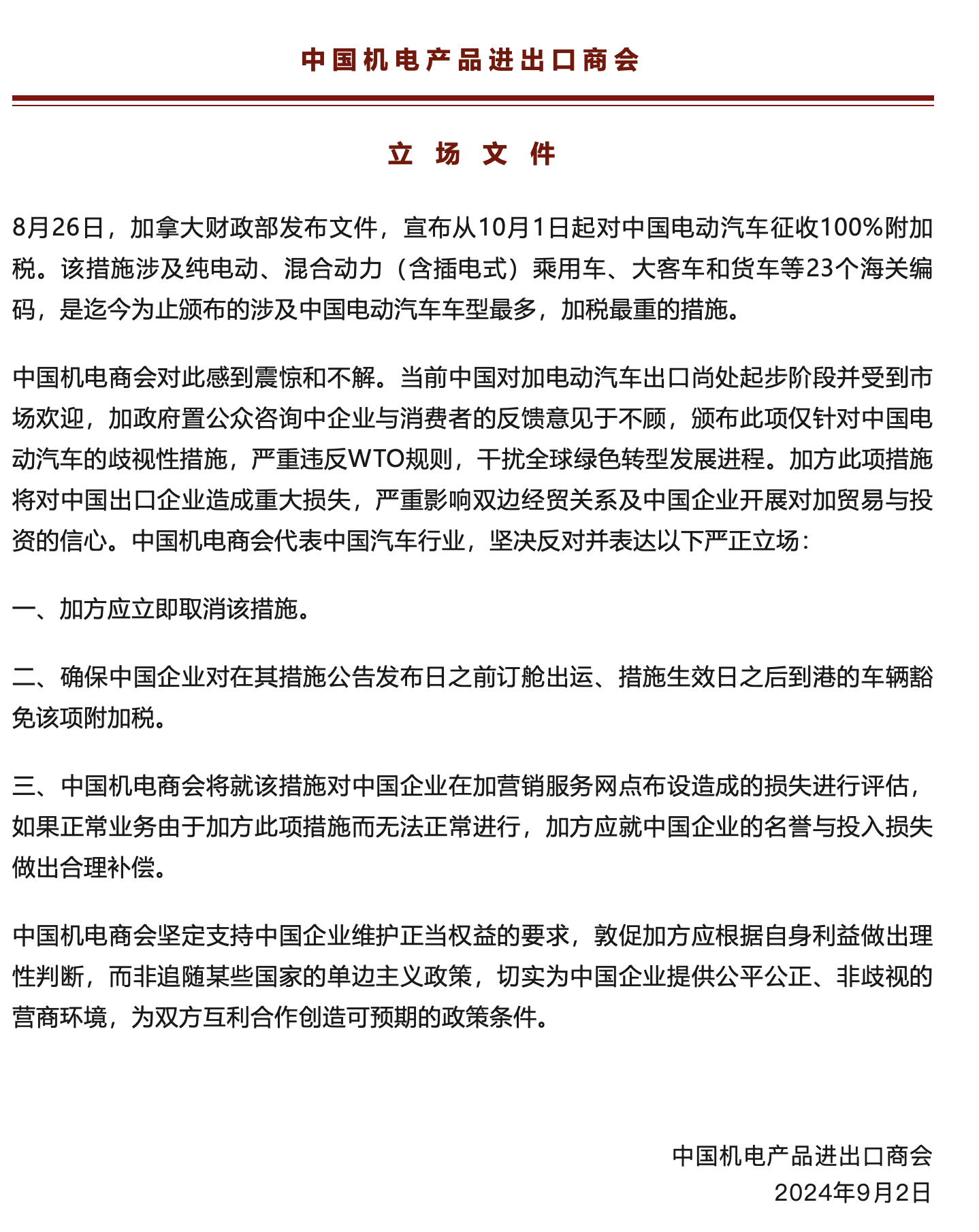 加拿大拟对中国电动汽车征收100%附加税 中国机电商会回应股速查加拿大拟对中国电动汽车征收100%附加税 中国机电商会回应