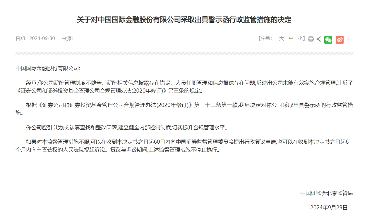 北京证监局:对中金公司采取出具警示函行政监管措施北京证监局:对中金公司采取出具警示函行政监管措施