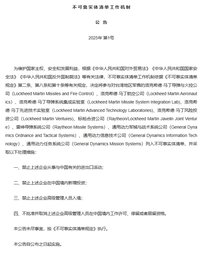 商务部:对洛克希德·马丁导弹与火控公司等10家美国企业采取不可靠实体清单措施商务部:对洛克希德·马丁导弹与火控公司等10家美国企业采取不可靠实体清单措施