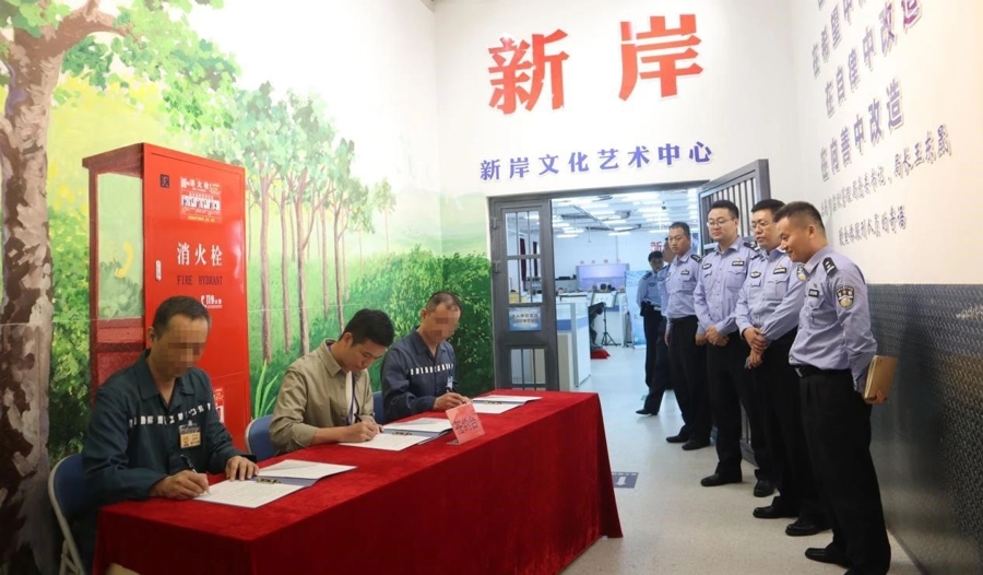 前两天,这里刚结束一次矛盾调解会。服刑人员王某和韦某在承诺书上按下手印,握手言和。他们一个是19岁就常进看守所的“老官司”,一个是有两次暴力前科的“暴脾气”,半年前,他们之间还充满了火药味,总把“生死看淡、不服就干”挂在嘴上。