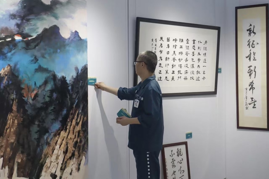 除了画作,这里还展出了书法、掐丝珐琅、金山农民画、叶雕、蛋雕、烙画等各种形式的工艺美术作品,展现了监狱文化艺术矫治的成果。很多作品还走出了大墙,走进了大学艺术学院的画廊,爱心拍卖会的会场。不少服刑人员凭借在习美活动中掌握的技艺,在回归之前与用人单位签订了劳动协议。
