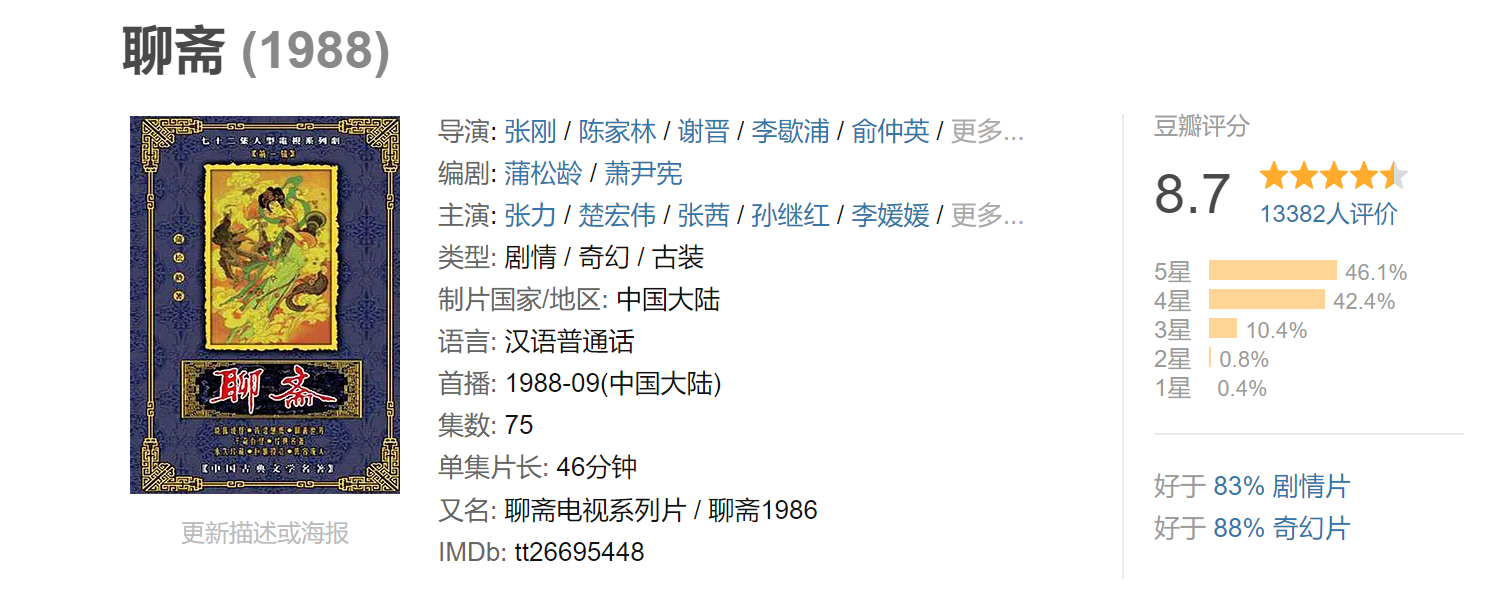 除了这四大经典以外,还有一部在民间被称为第五大名著的《聊斋志异》,也有大地方电视台做背景,并邀请了谢晋、王扶林、陈家林这些大佬做主创阵容,成就了难以逾越的88 版经典《聊斋》。