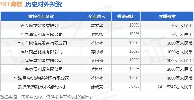 本站消息,根据天眼查APP显示闻喜,*ST海钦(600753)新增一起对外投资事件,被投资公司为嘉兴海钦能源有限公司,法定代表人雷安华,投资占比为100%。该公司从事电力、热力生产和供应业,注册资本为50万人民币。目前,*ST海钦共存在对外投资8项,详见下表: