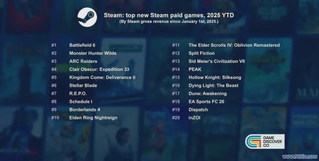 就在前几天媒体GameDiscoverCo发布了“2025年Steam平台收入最高的新付费游戏”榜单。