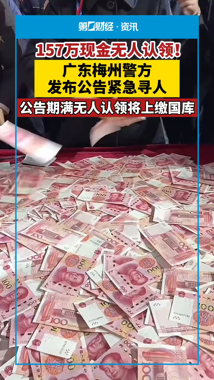 00'07'' 157万现金无人认领!广东梅州警方发布公告紧急寻人,公告期满无人认领将上缴国库157万现金无人认领!广东梅州警方发布公告紧急寻人,公告期满无人认领将上缴国库