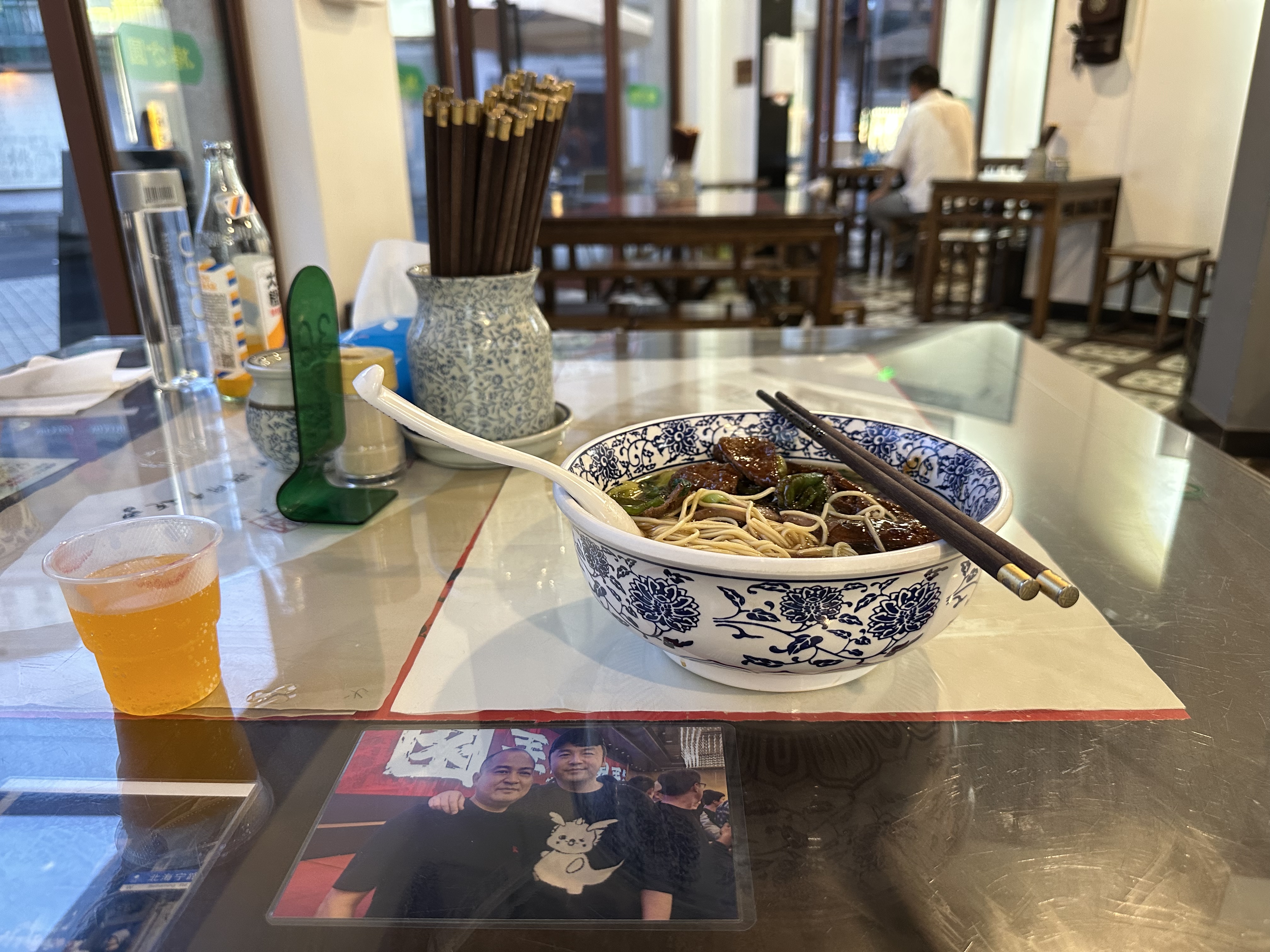 其中有一家本帮风格的面馆“椿方圆”,第一财经记者走进这家面馆,看到玻璃桌面下放置着不少电影《酱园弄·悬案》的剧组人员与演员合影,而其中一位剧组人员就是正在收银台工作的老板虞先生。